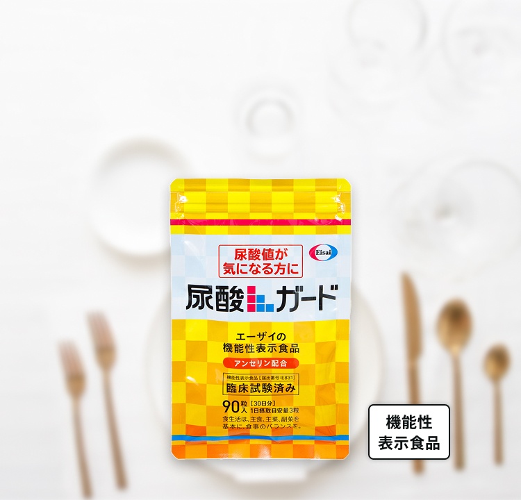 - 【届出表示】本品にはアンセリンが含まれるので、尿酸値が高め(尿酸値5.5~7.0mg/dL)の方の尿酸値の上昇を抑制する機能があります。